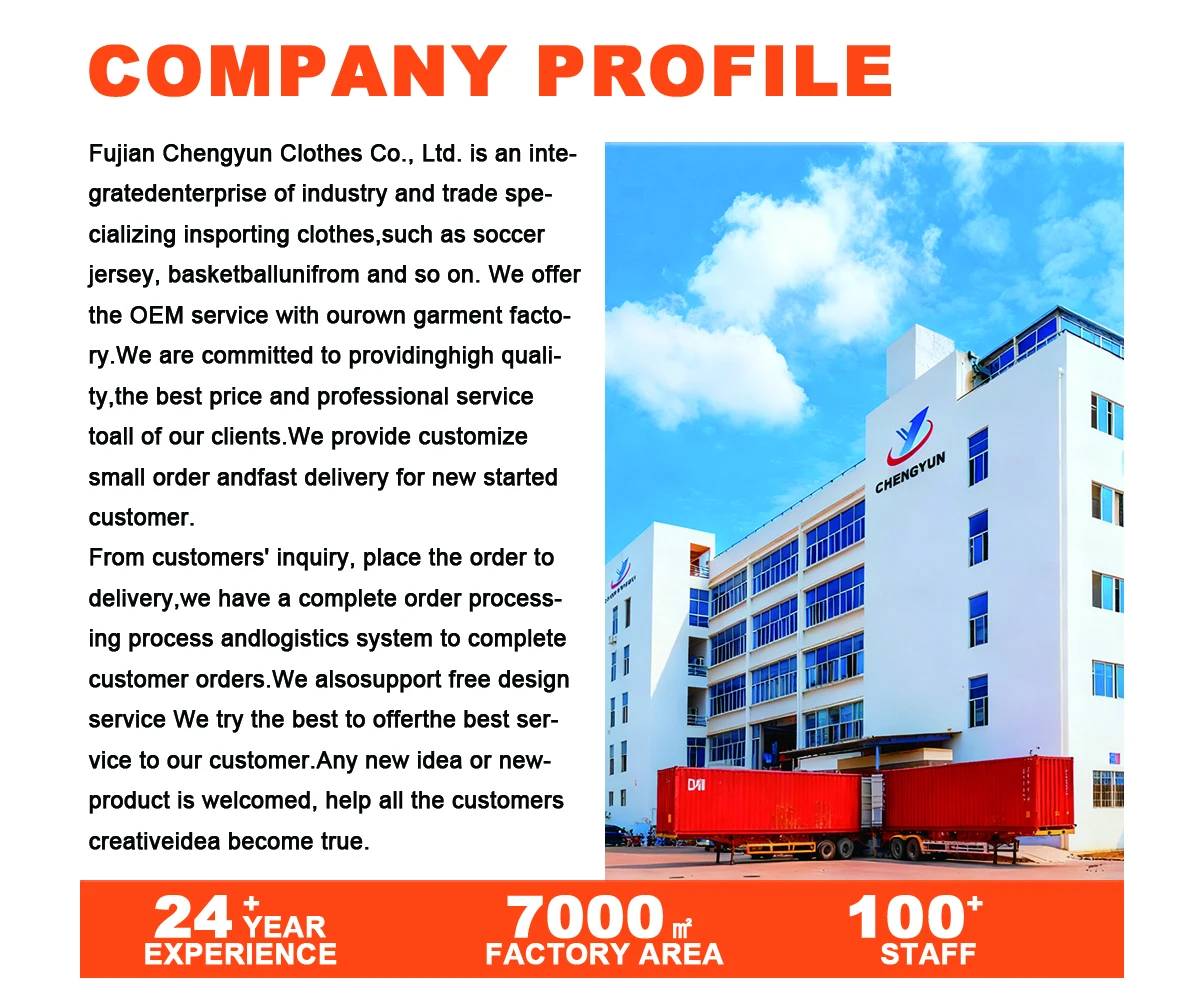 Fujian Chengyun Clothes Co., Ltd. is an integrated enterprise of industry and trade specializing in sporting clothes,such as soccer jersey, basketball unifrom and so on. We offer the OEM service with our own garment factory.We are committed to providing high quality, the best price and professional service to all of our clients.We provide customize small order and fast delivery for new started customer. From customers' inquiry, place the order to delivery, we have a complete order processing process and logistics system to complete customer orders.We also support free design service We try the best to offer the best service to our customer.Any new idea or new product is welcomed, help all the customers creative idea become true.